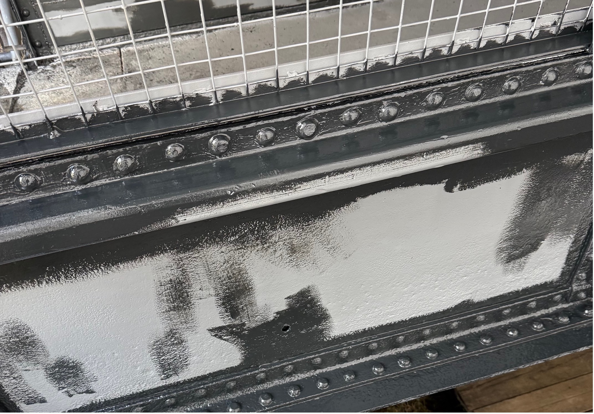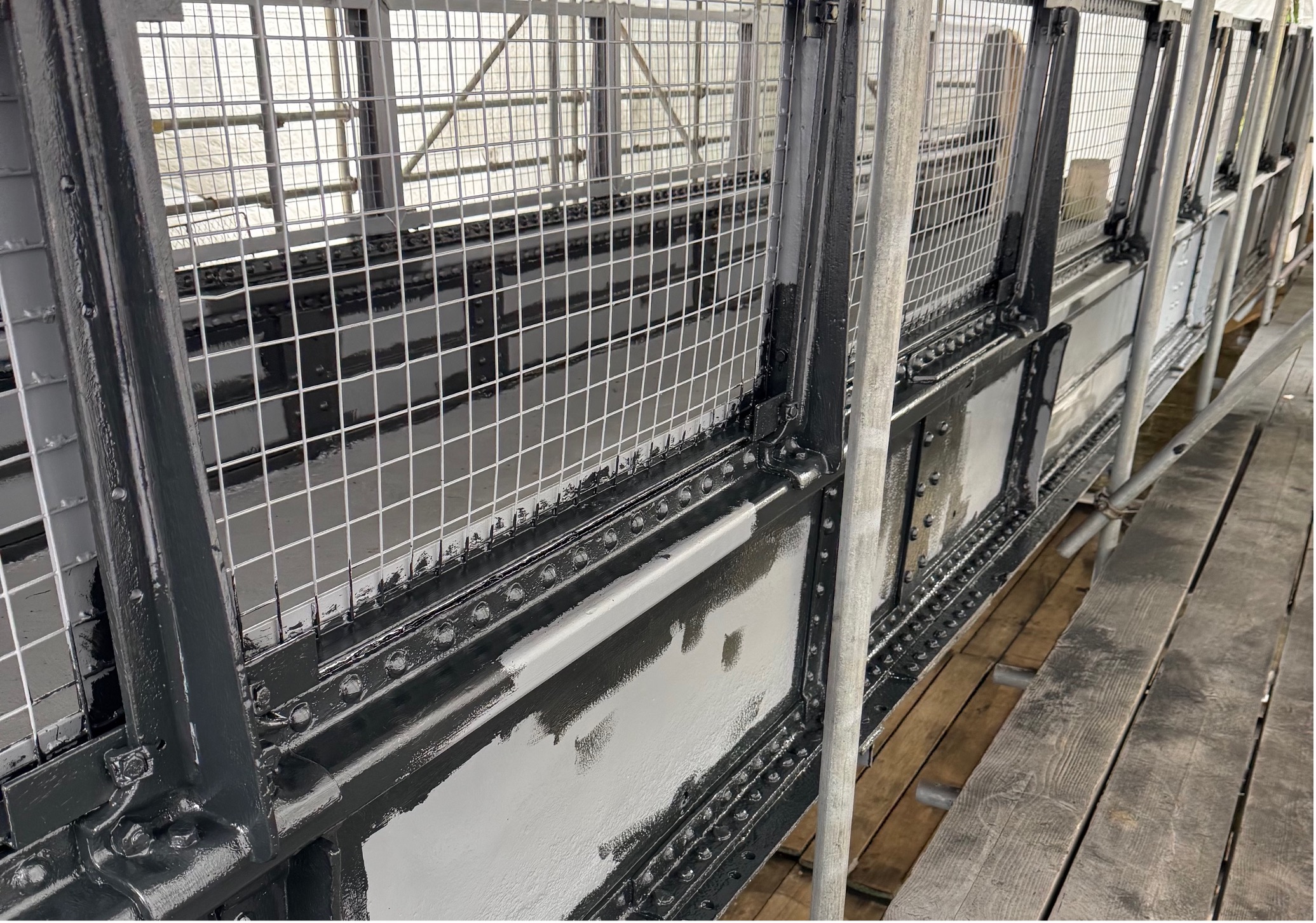 Once the metal of the bridge was shot blasted to be properly cleaned and profiled, we could begin to apply the weatherproof coating system. For this bridge restoration project in Devizes, Wiltshire we applied our signature multi-stage 2K Epoxy-Hybrid system, offering up to 30-years protection to first maintenance. This is a popular protective system for use on steel structures, particularly those exposed to weather conditions such as this bridge is. The final finish is a Satin Black as requested by Historic Railways.