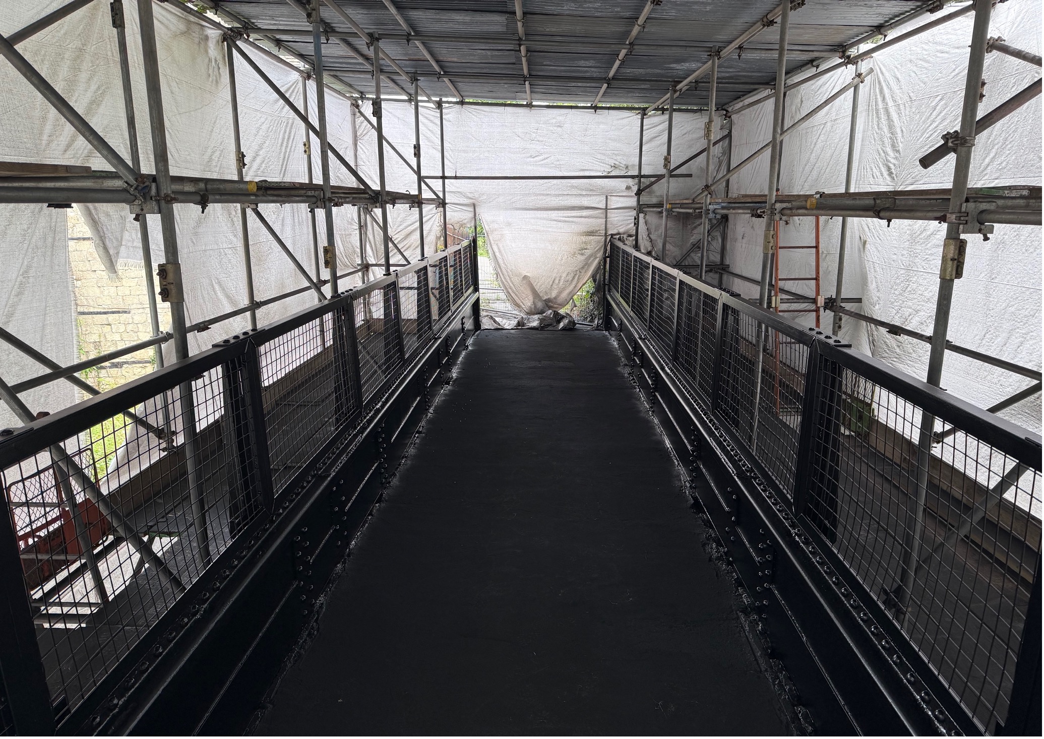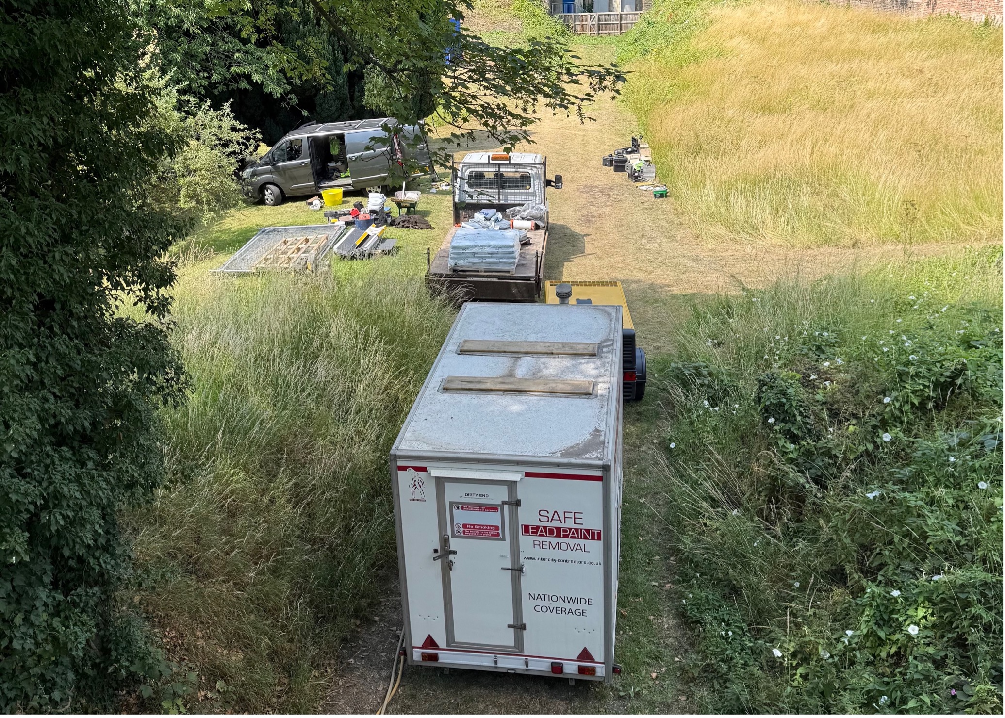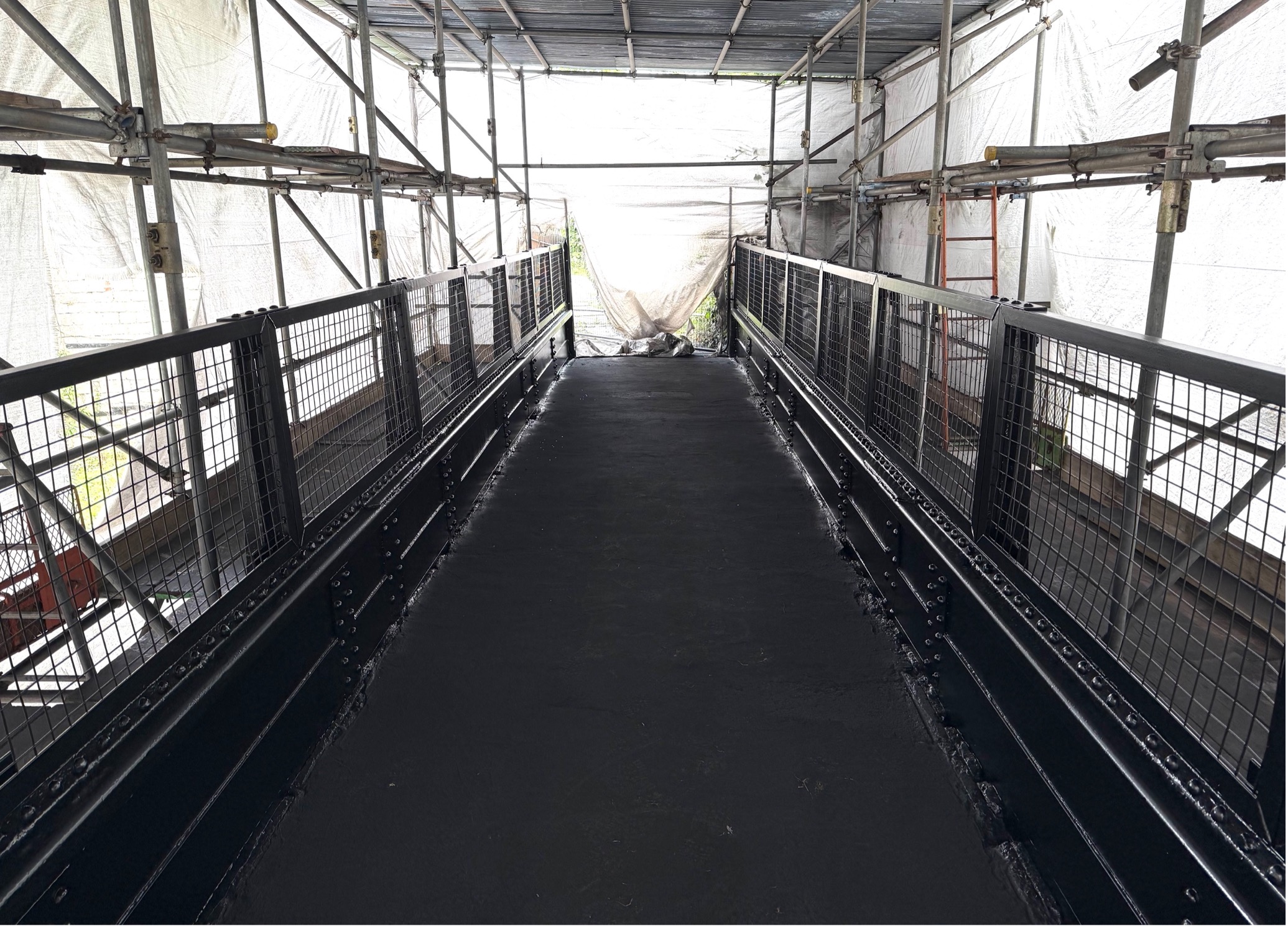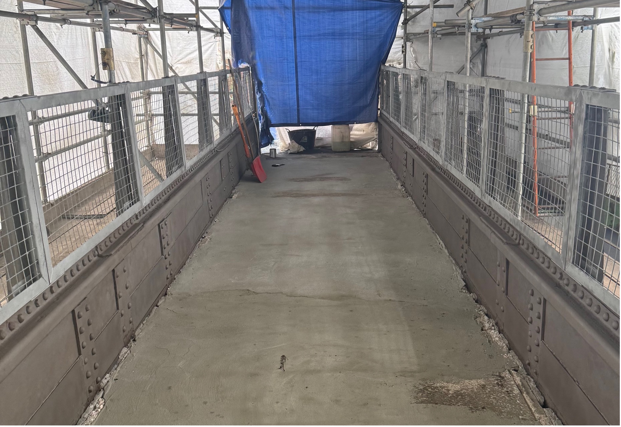 As per usual for these bridge shot blasting projects, our first task was to safely extract samples of the existing coating to send to the laboratory for lead content testing. Once we receive the results of the samples, we could begin to remove the old coating in a safe and controlled manor via the method of bridge shot blasting. With the historic bridge fully enclosed and restricted from the public, we arrived with one of our modular decontamination units and our lead trained bridge shot blasting team to begin to shot blast the old coating from the steel bridge structure and clean the metal to Sa2.5 standard before coating.